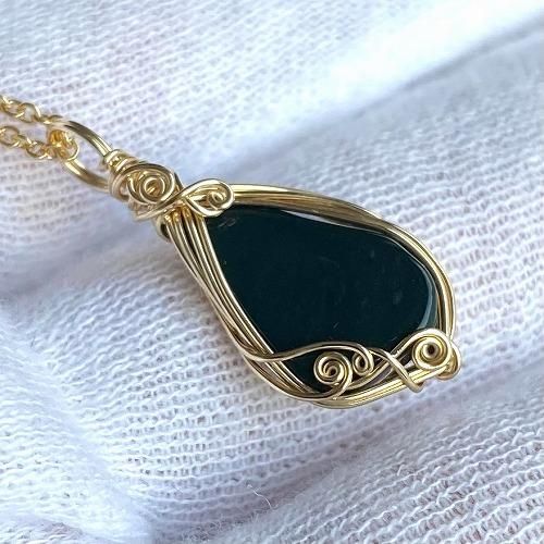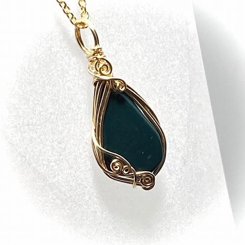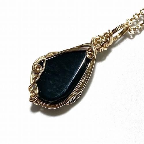 【 碧玉 ワイヤーラップペンダント 14kgfチェーン 】 青めのう 碧石 出雲石 天然石 貴石細工 パワーストーン ゴールド