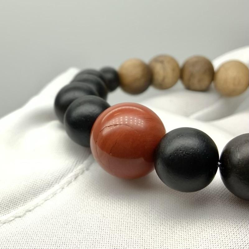 | 素材 | 【佐渡の赤玉石】 約15mm玉 1個 【出雲黒柿】 約11mm玉×18 約8mm玉×2 お仕立て:シリコンゴム  |