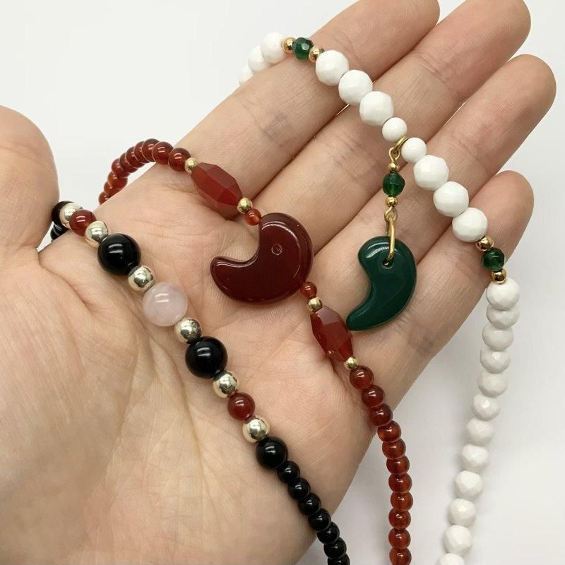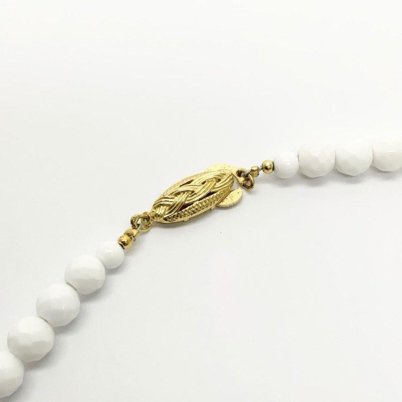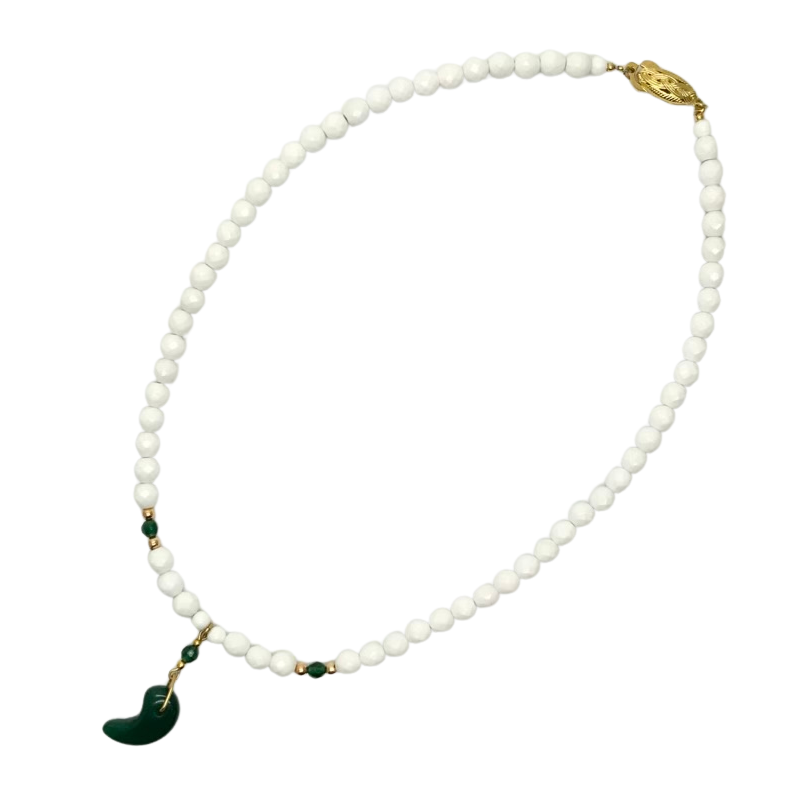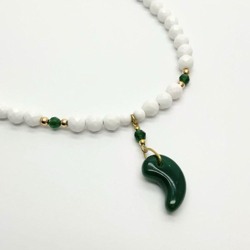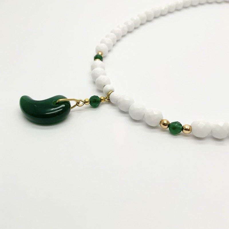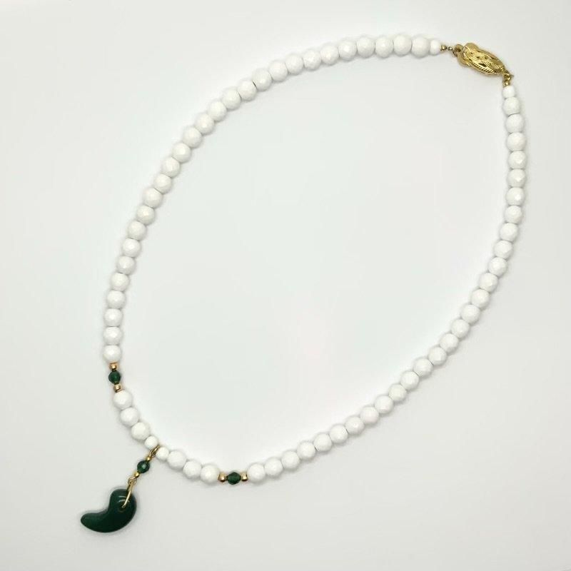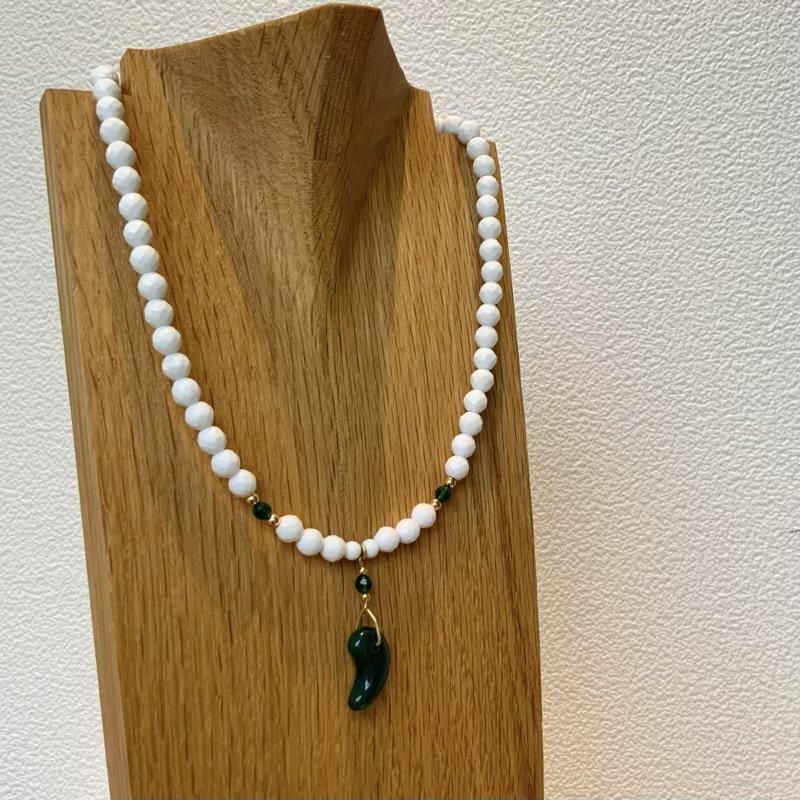 白(オニキス)で全体をまとめ、真ん中に金と緑をポイントに置いたことで勾玉が引き立っています。存在感のあるネックレスを是非ご堪能下さい。