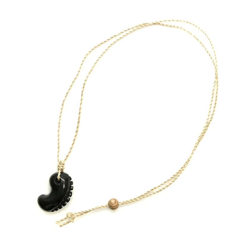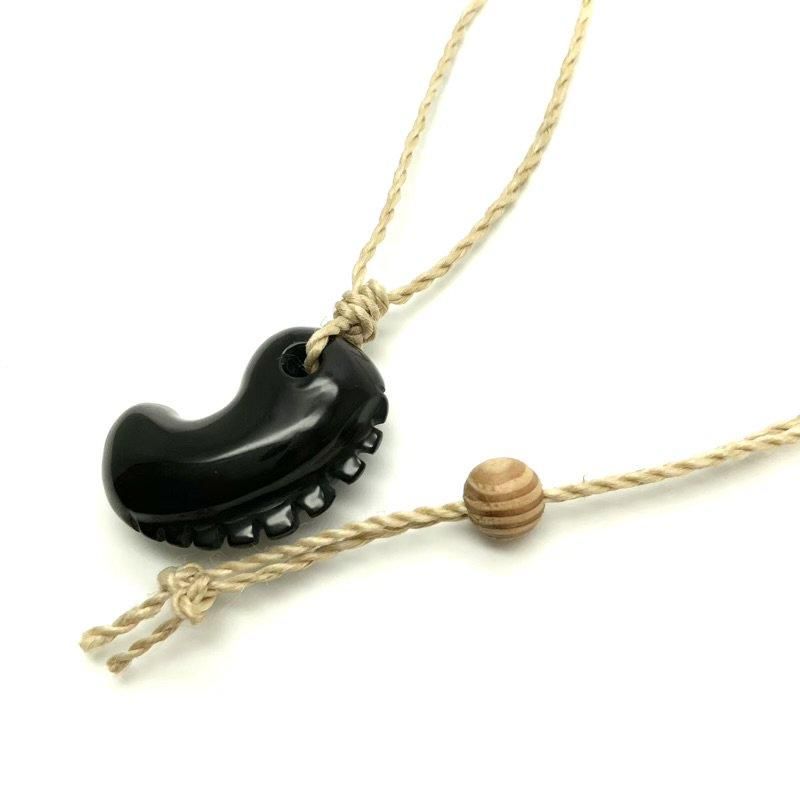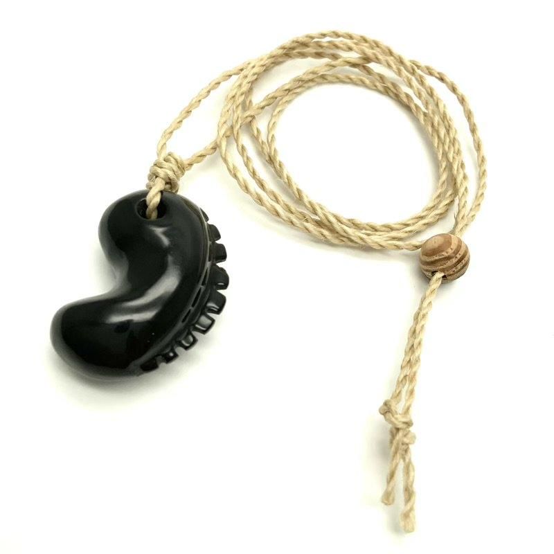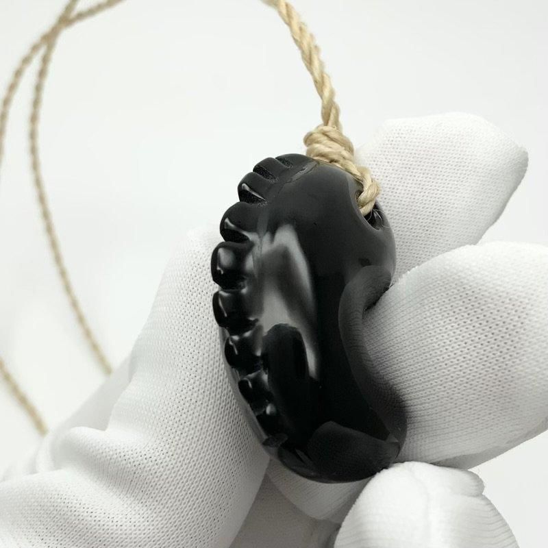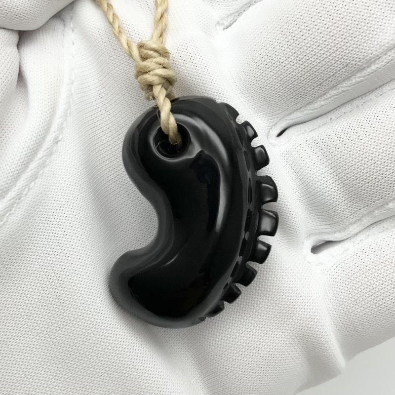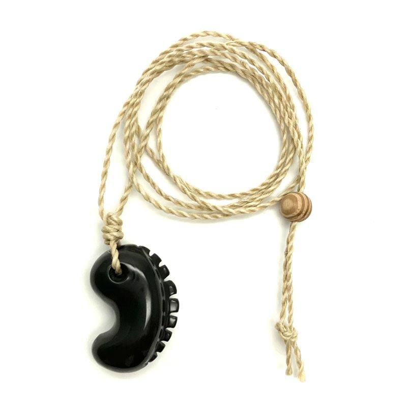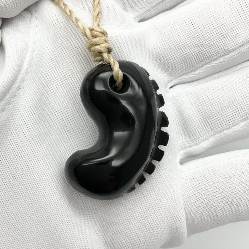 隠岐の島産黒曜石の勾玉を国産大麻紐ペンダントにお仕立てしました。