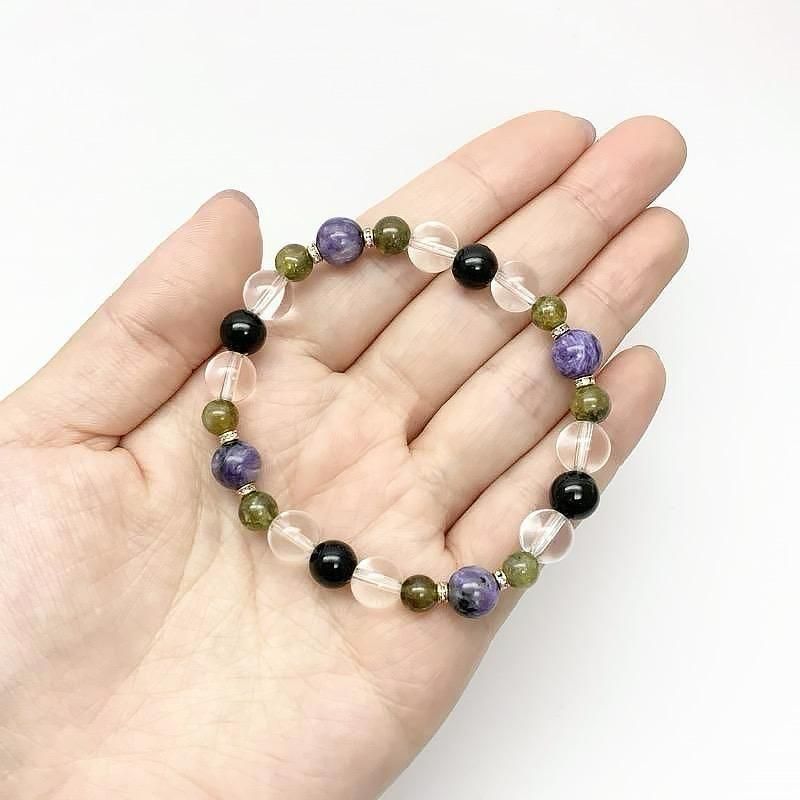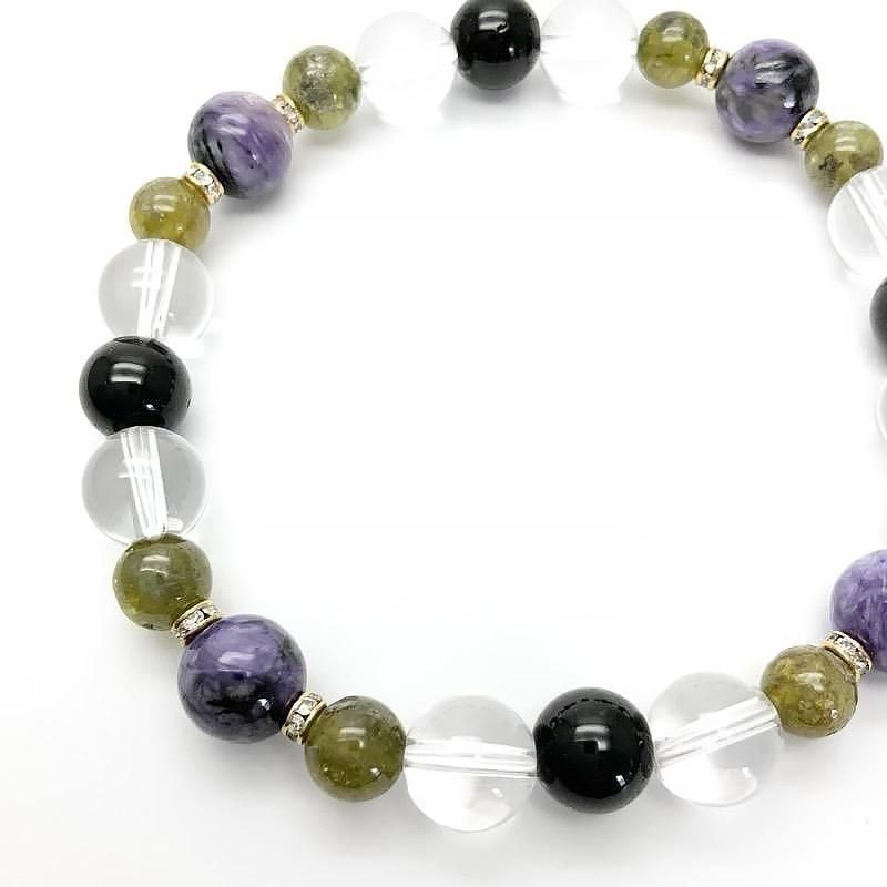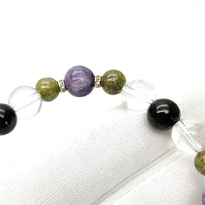 サイズ等 | チャロアイト 直径8mm前後 ブラックトルマリン 直径8mm前後 水晶 直径8mm前後 グリーンガーネット 直径6mm前後 ブレスレット内周15cm ・サイズ調整不可 ・ご注文時にはメジャー等で手首周りサイズをご確認ください。 ・平均的な手首周りサイズ 女性:14-16cm 男性:16-18cm |