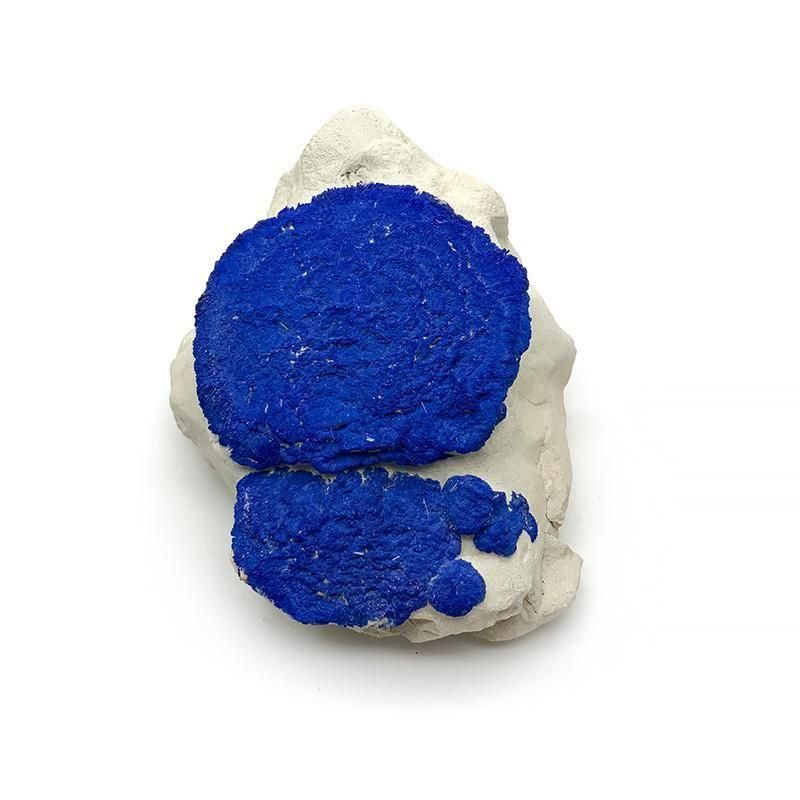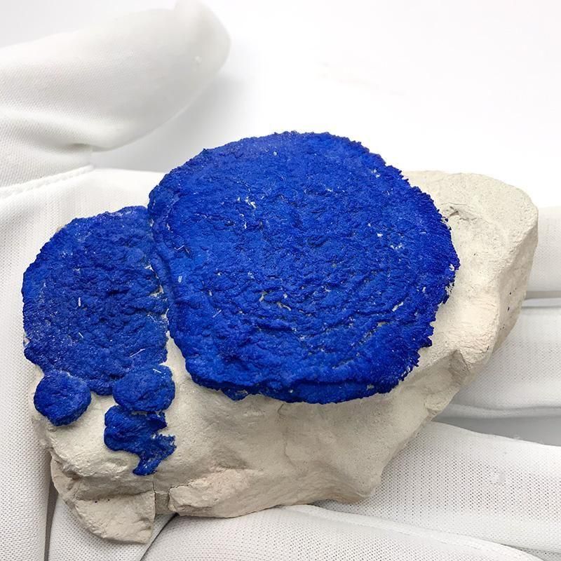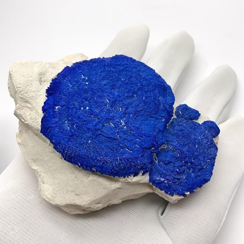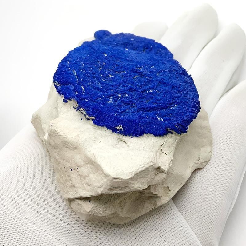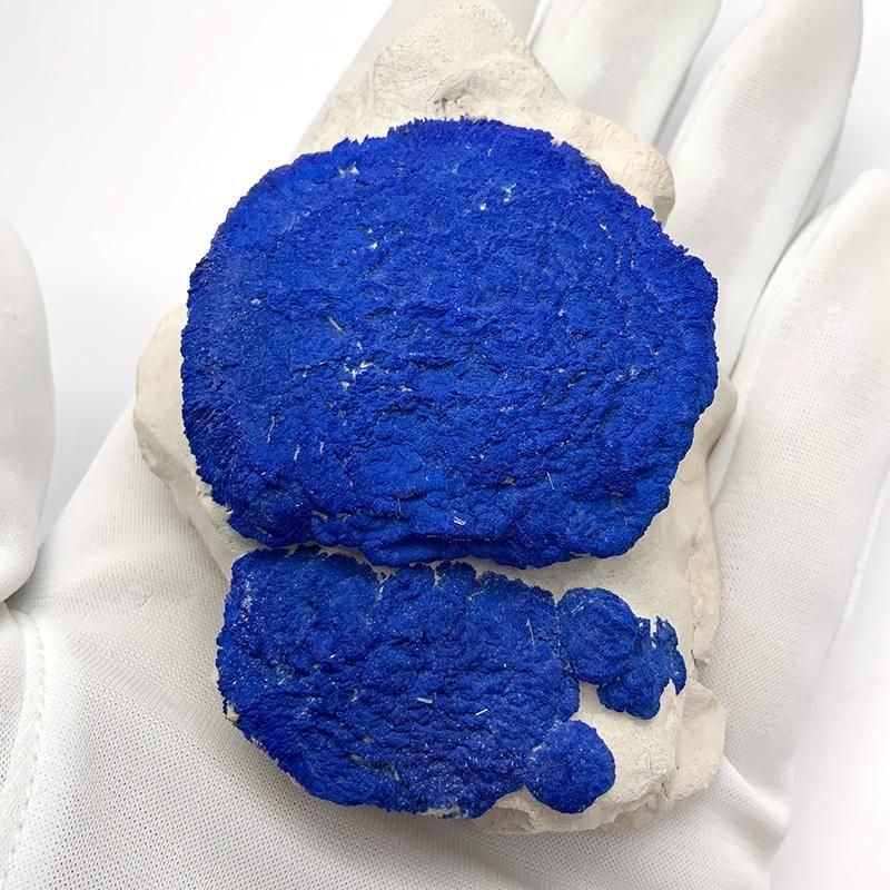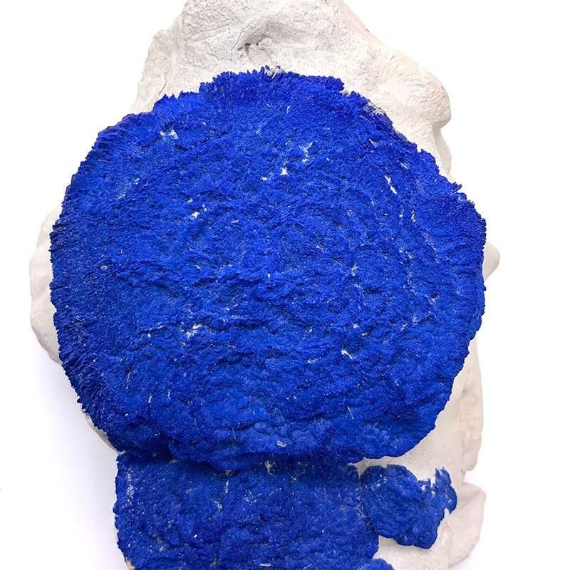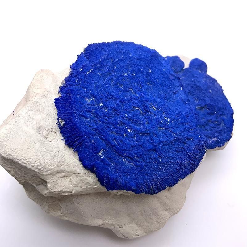 深い群青色の藍銅鉱が、カオリン化シルト岩の中で銅を含んだ地下水(熱水)の化学反応により沈殿し、太陽のような円形に結晶化した地質学的な奇跡。