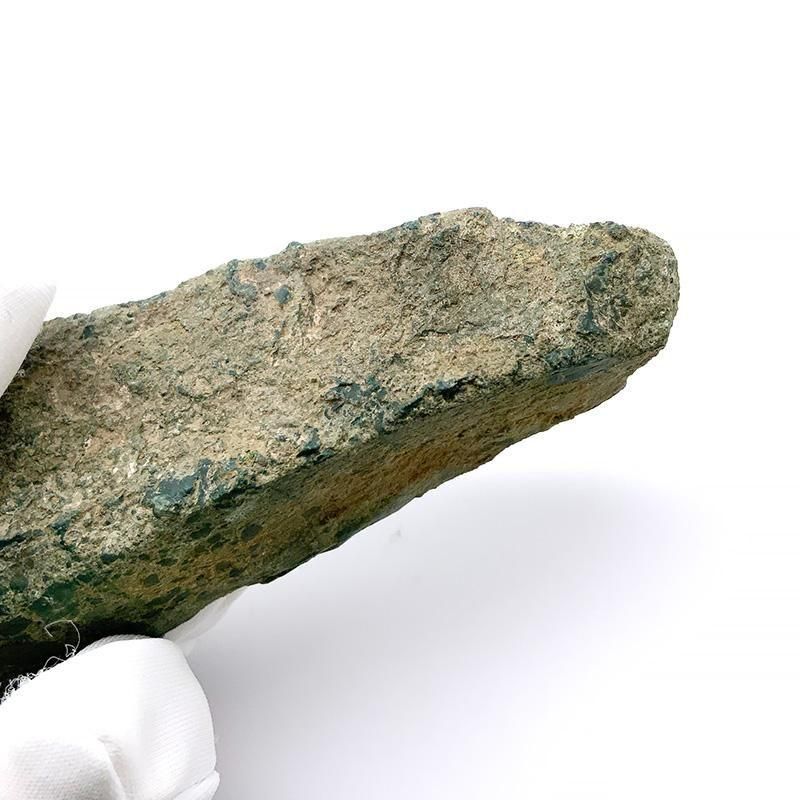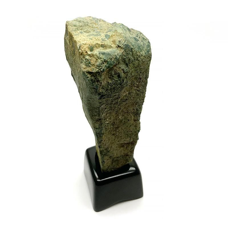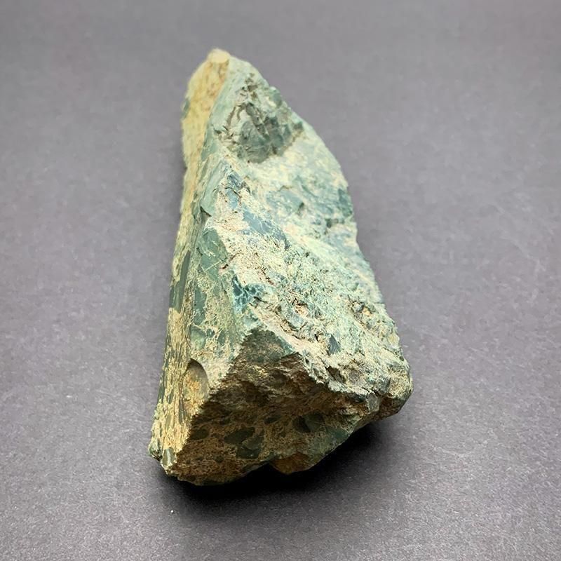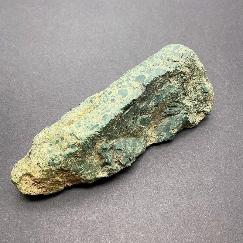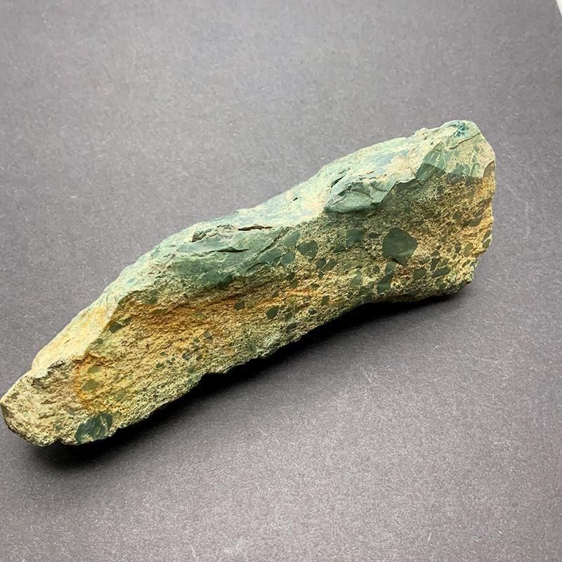 自然が刻んだ凹凸や割れ口をそのまま残し、深い緑と土色のまだら模様が重厚な趣を醸し出しています。人工的な加工では決して生み出せない、荒々しくも静かな存在感が魅力です。