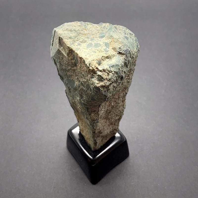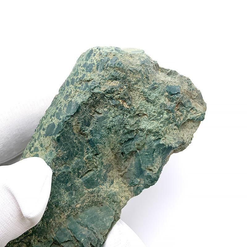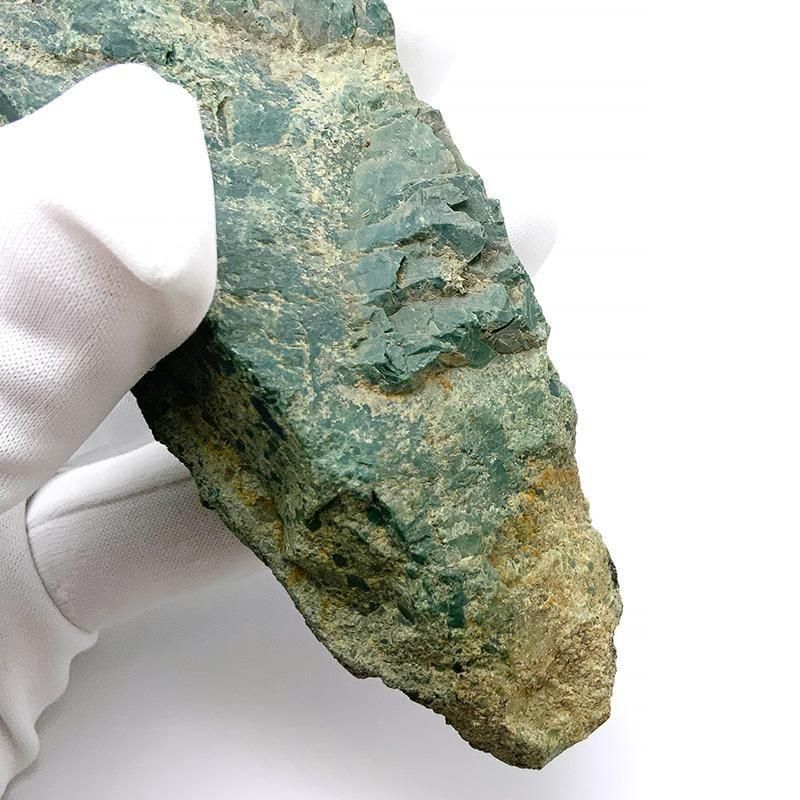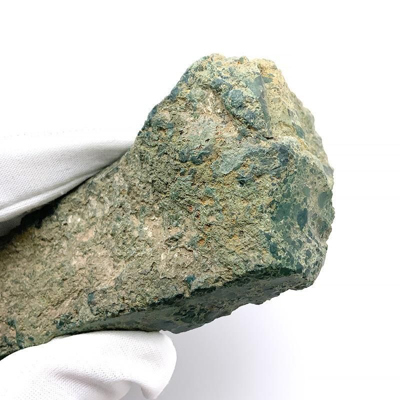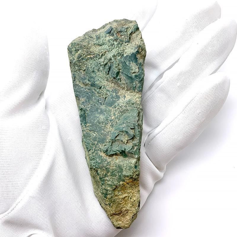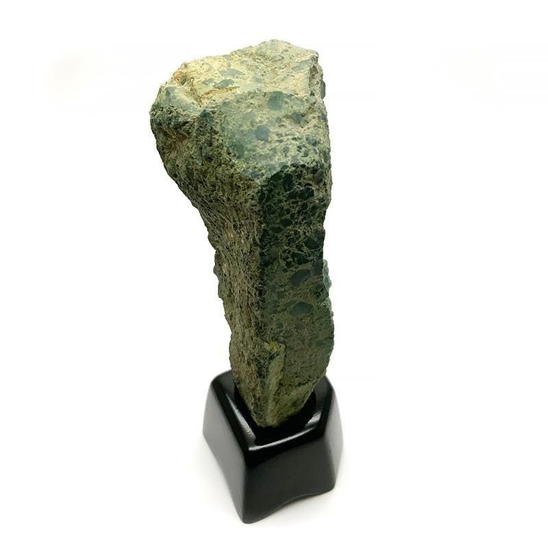 自然が刻んだ凹凸や割れ口をそのまま残し、深い緑と土色のまだら模様が重厚な趣を醸し出しています。人工的な加工では決して生み出せない、荒々しくも静かな存在感が魅力です。