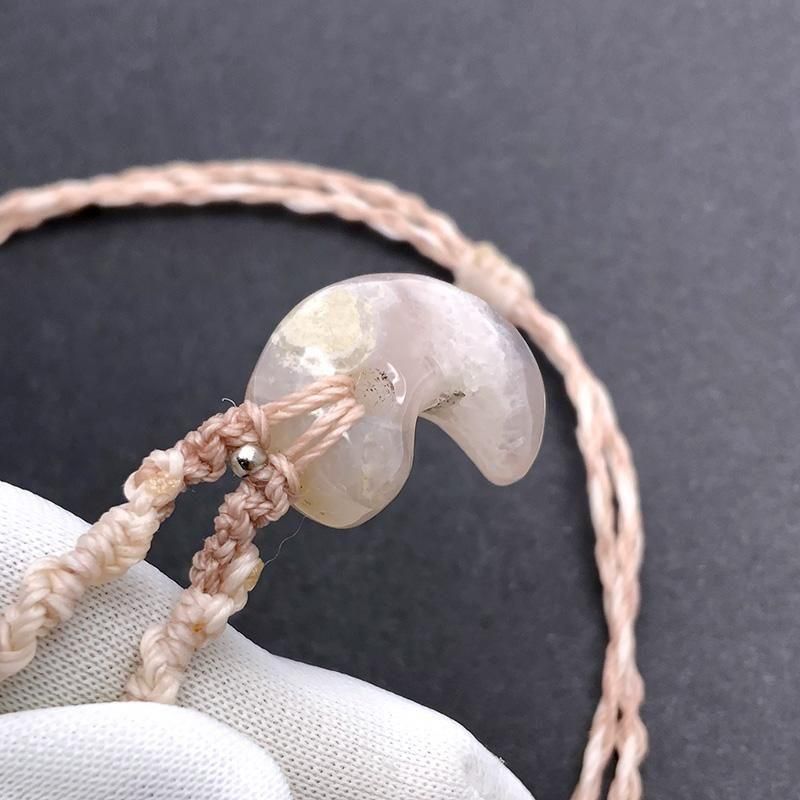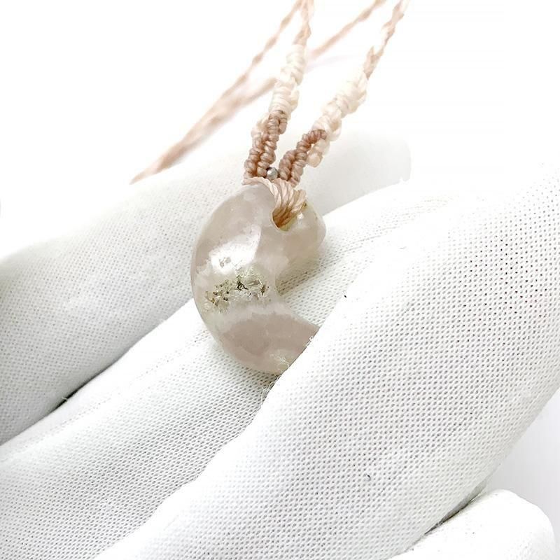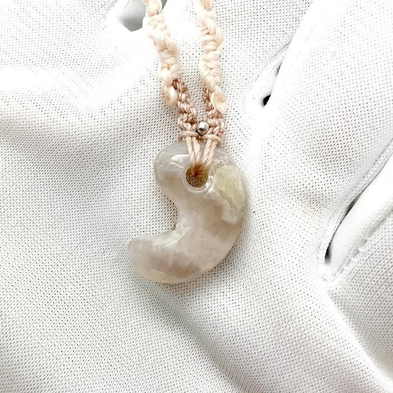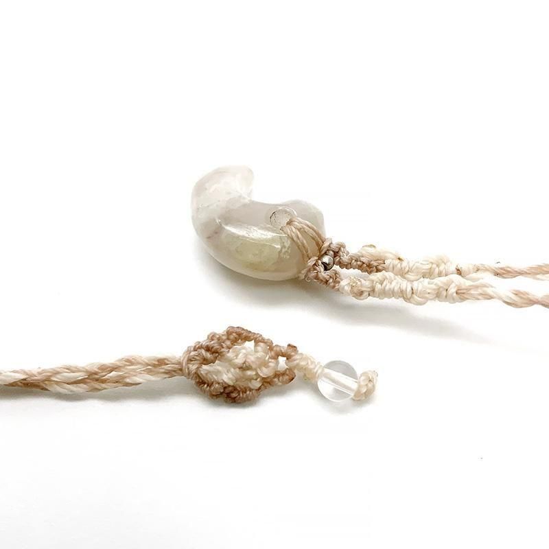 勾玉を包むマクラメ編み部分は、メタルビーズを