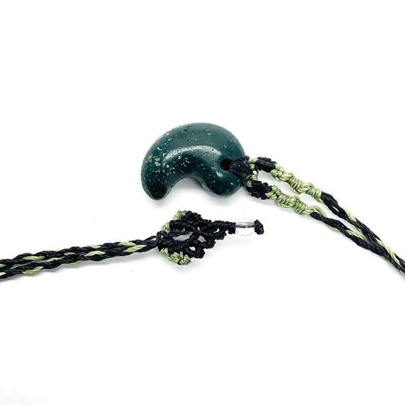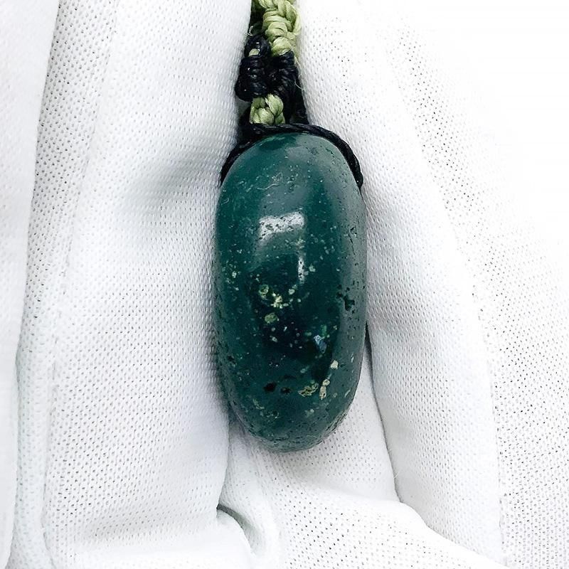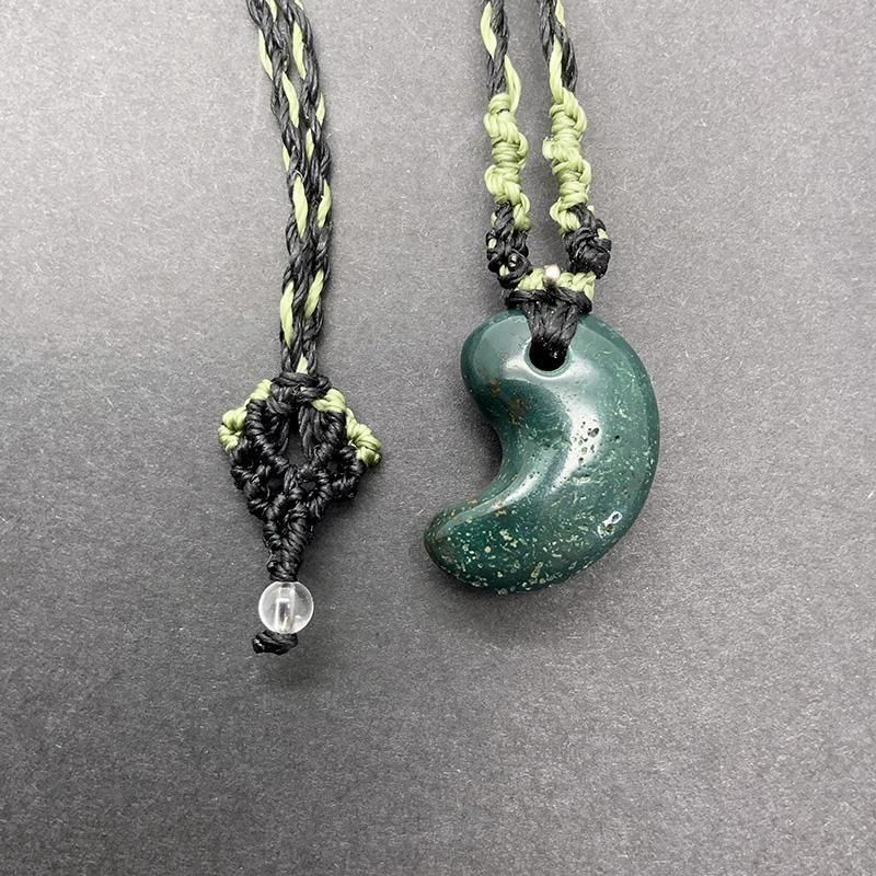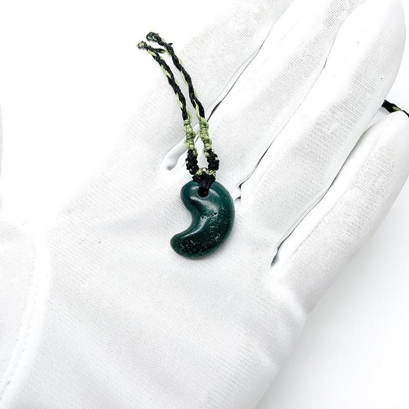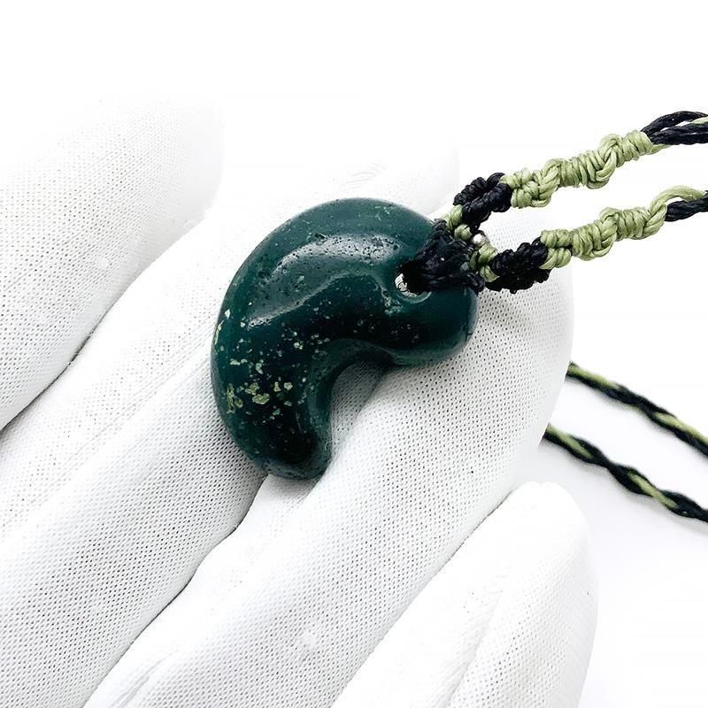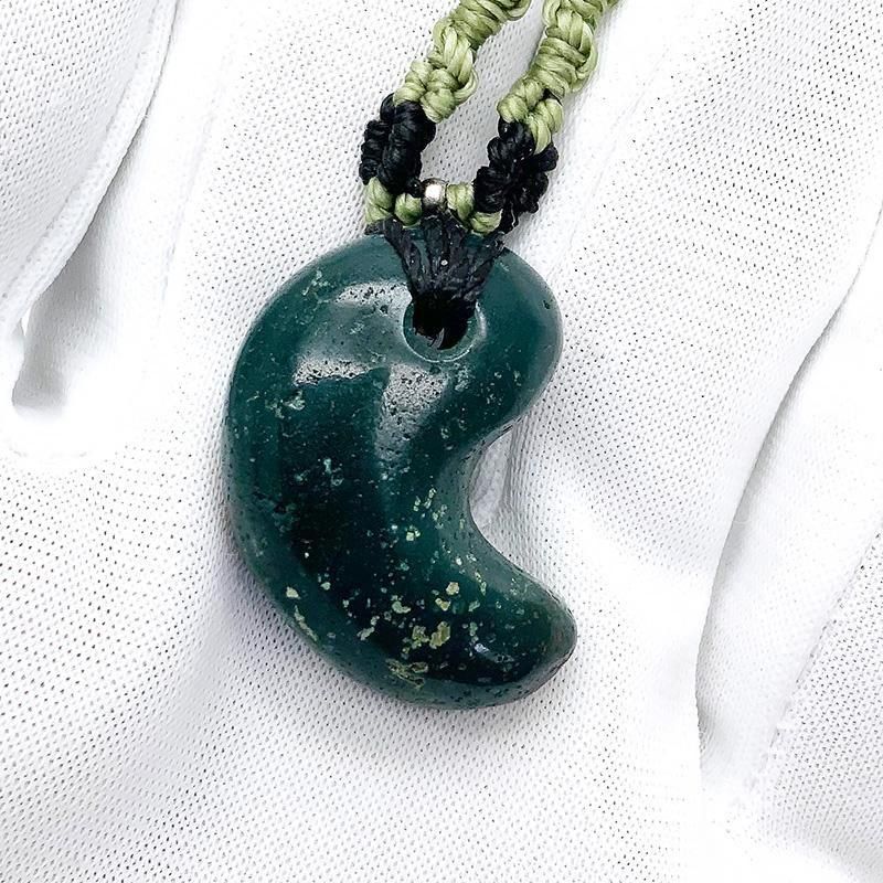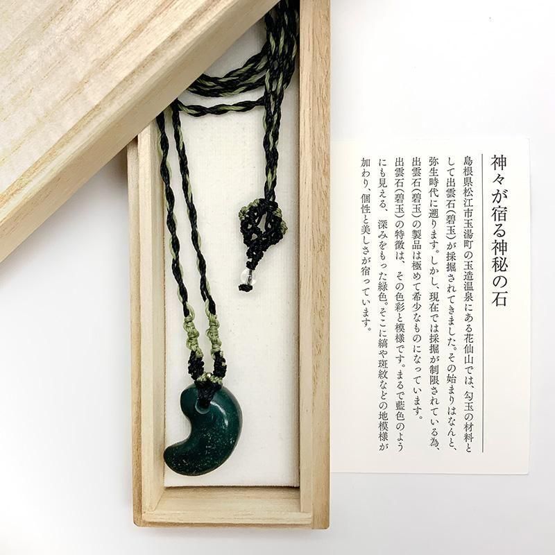 深緑の出雲石(碧玉)を磨き上げた勾玉を、マクラメ編みで仕立てたペンダント。