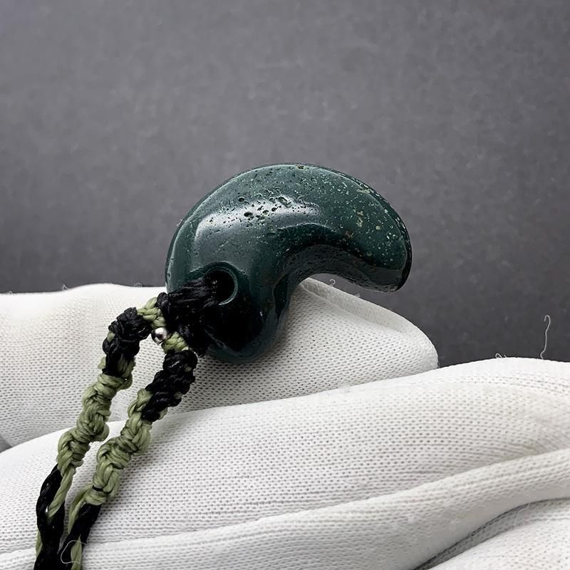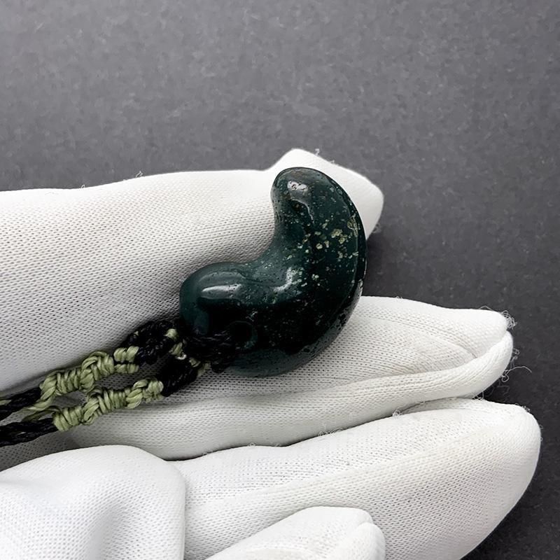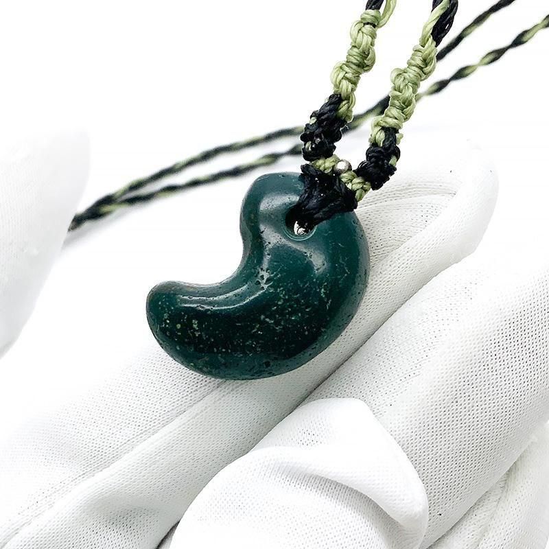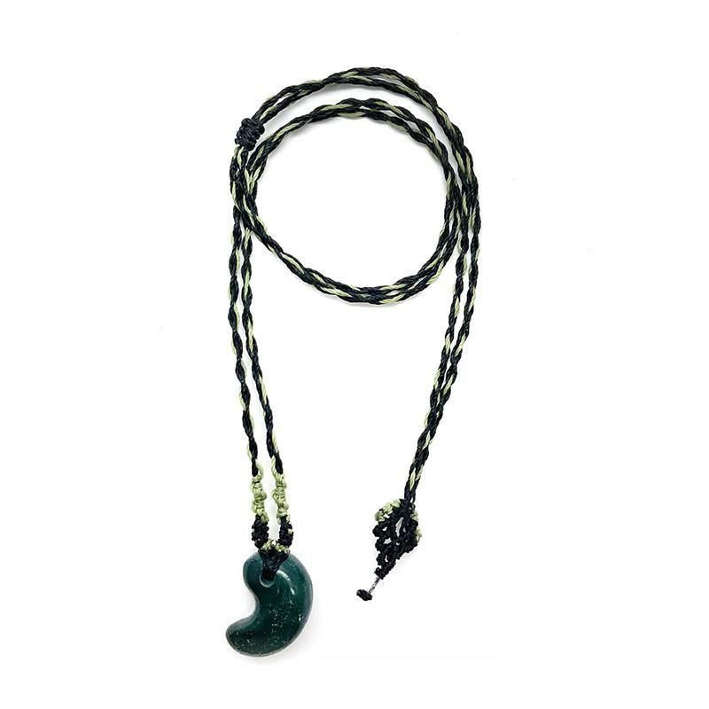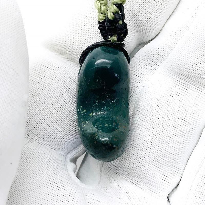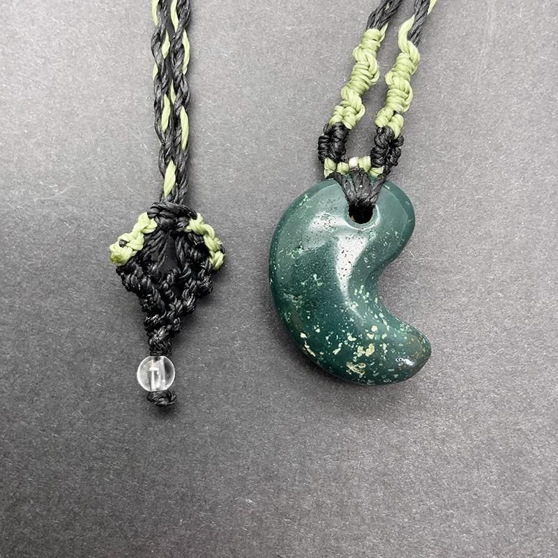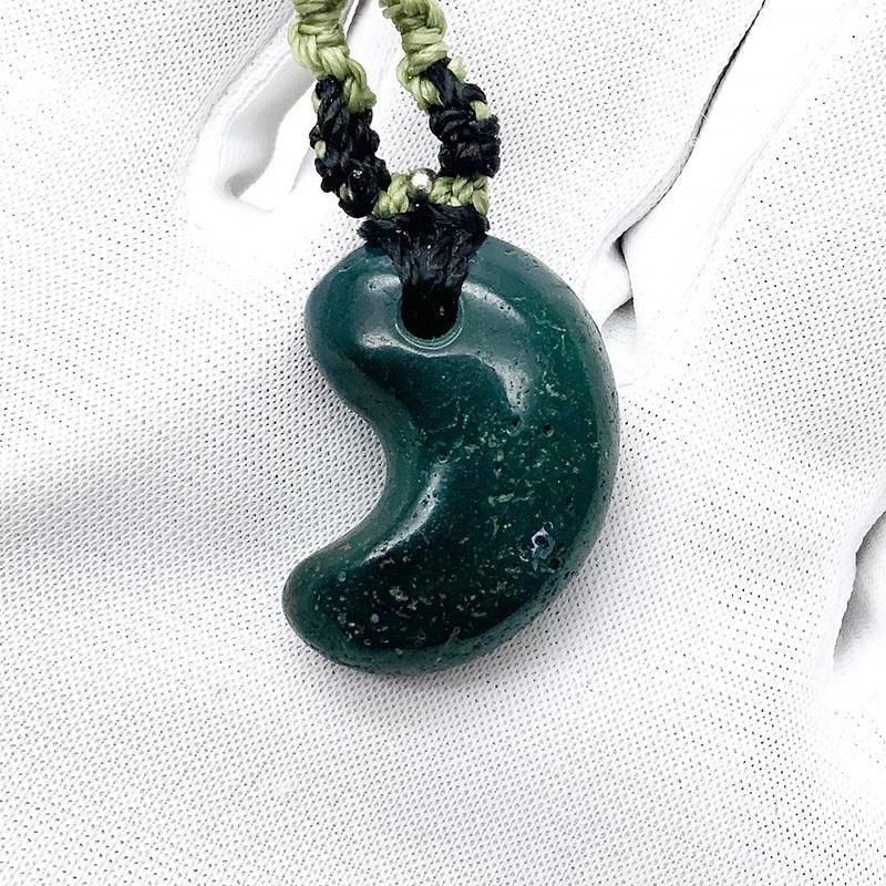 深緑の出雲石(碧玉)を磨き上げた勾玉を、マクラメ編みで仕立てたペンダント。