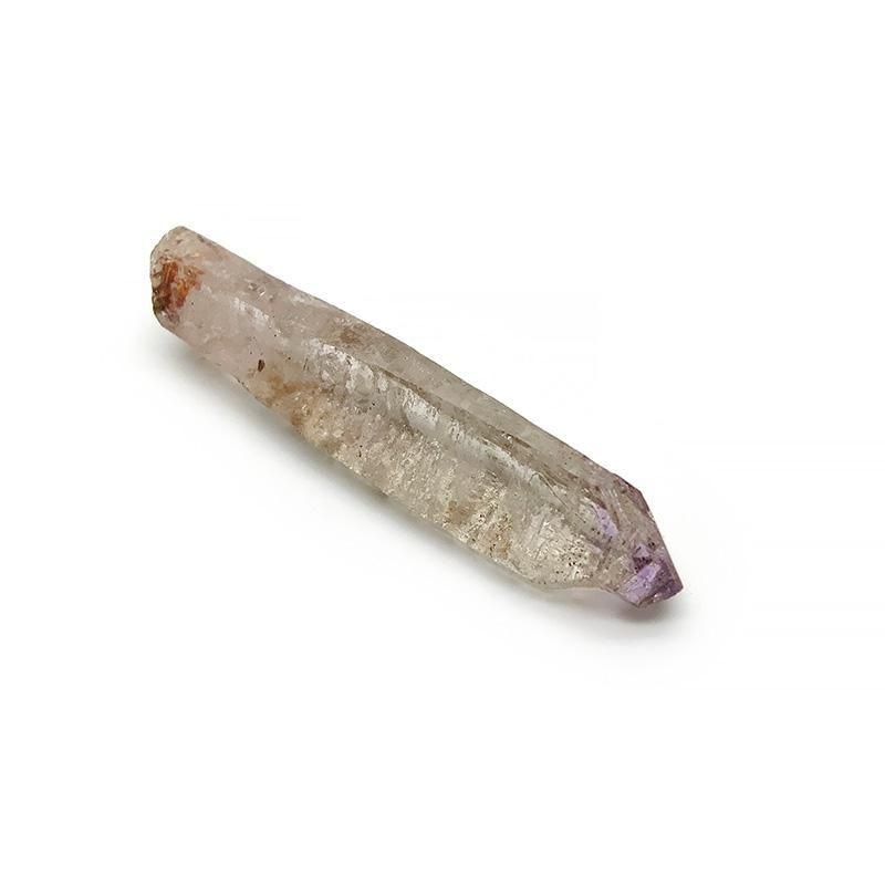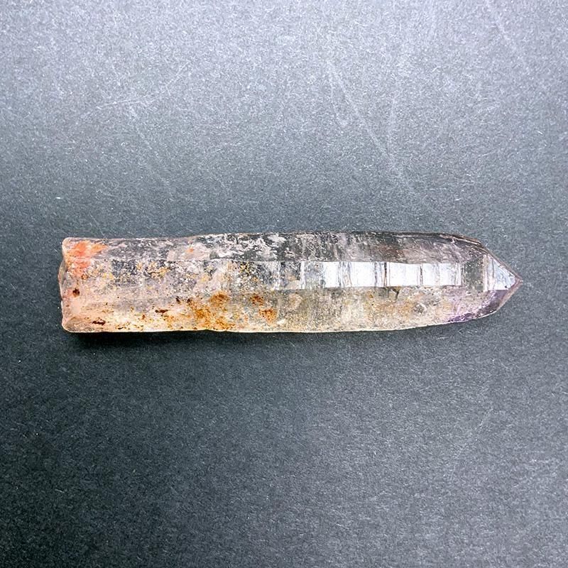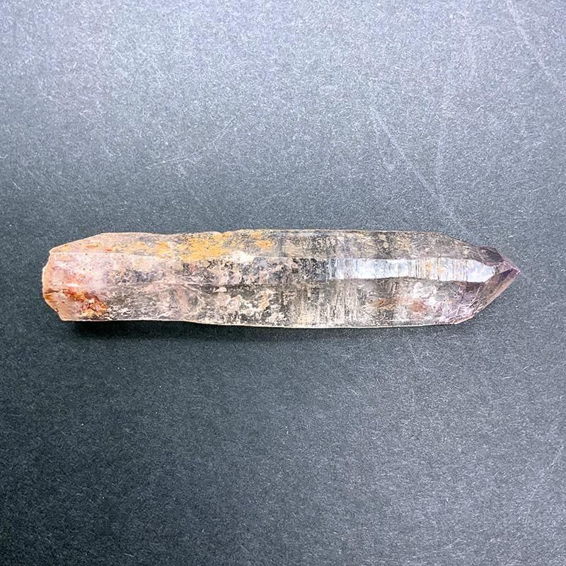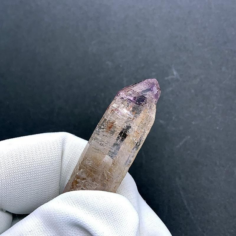 透明感のある結晶の中に、先端へ向かって淡く紫が溶け込む、やわらかな色合いの一本です。